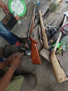 ๑. อาวุธปืนยาว แบบประดิษฐ์ขึ้นเอง ขนาด .๒๒ มม. ไม่มีหมายเลขประจำปืน ไม่มีหมายเลขทะเบียนปืน จำนวน ๑ กระบอก พบวางอยู่ข้างตัวของผู้ต้องหาขณะนั้น