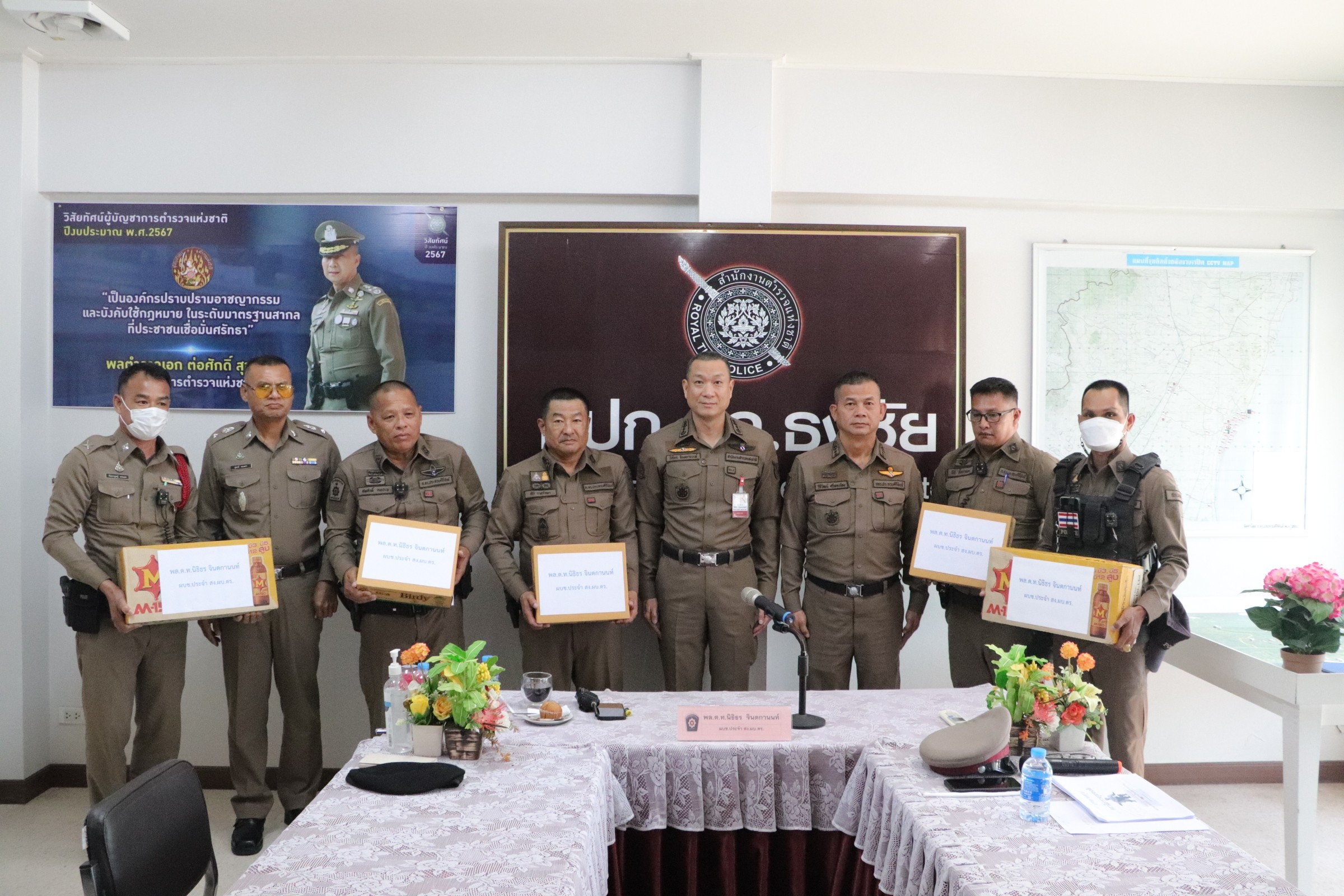 🔸 พร้อมได้มอบเงินบำรุงขวัญให้แก่ ร.ต.อ.สมศักดิ์ คงเปรม รอง สว(ป.)สภ.ธงชัย ที่ได้รับบาดเจ็บจากการปฏิบัติหน้าที่ และได้มอบแนวทางการปฏิบัติหน้าที่ในด้านต่างๆ พร้อมอาหารเครื่องดื่มให้แก่ข้าราชการตำรวจ สภ.ธงชัย