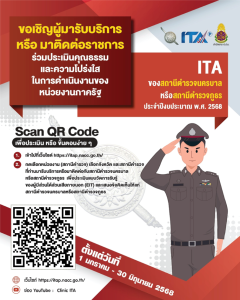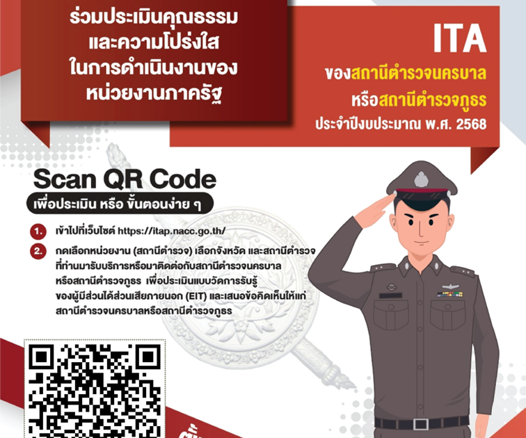 ขอเชิญ ผู้มารับบริการหรือมาติดต่อราชการ ร่วมประเมินคุณธรรมและความโปร่งใสในการดำเนินงานของหน่วยงานภาครัฐ (Integrity and Transparency Assessment : ITA) สถานีตำรวจภูธรธงชัยปีงบประมาณ พ.ศ. 2568