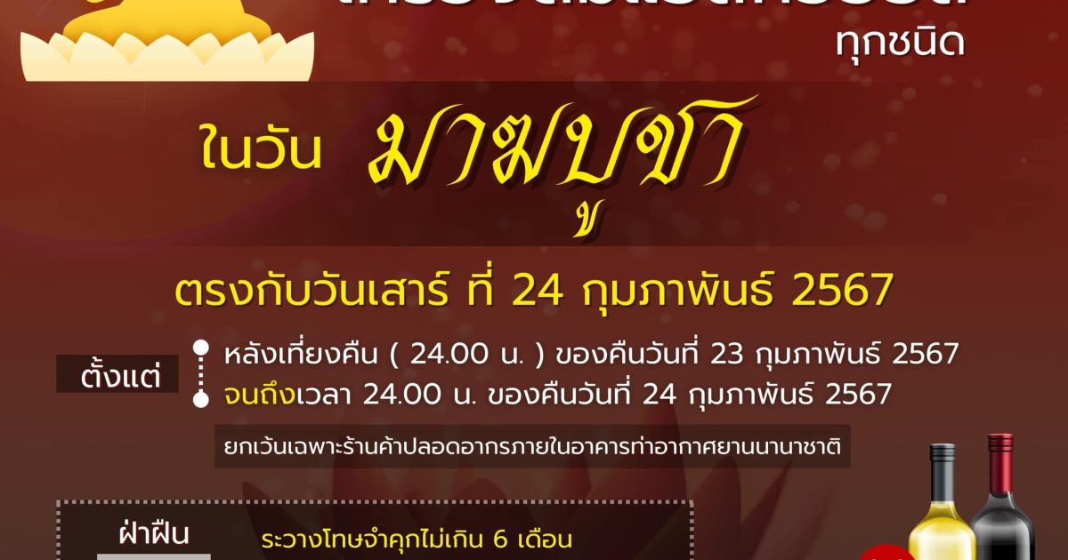 สำนักงานตำรวจแห่งชาติเตือนงดจำหน่ายเครื่องดื่มแอลกอฮอล์ เนื่องในวันมาฆบูชา ประจำปี 2567 ทุกช่องทาง ด้านผู้บัญชาการตำรวจแห่งชาติกำชับดูแลความปลอดภัย พร้อมอำนวยความสะดวกการจราจรสถานที่สำคัญทางพุทธศาสนา และสถานที่ท่องเที่ยว พ.ต.อ.หญิง ฉันฉาย รัตนพานิช รองโฆษกสำนักงานตำรวจแห่งชาติ เปิดเผยว่า ในวันที่ 24 กุมภาพันธ์ 2567 เป็นวันสำคัญทางพระพุทธศาสนา คือวันมาฆบูชา และมีวันหยุดชดเชยรวม 3 วันนั้น พล.ต.อ.ต่อศักดิ์ สุขวิมล ผู้บัญชาการตำรวจแห่งชาติ มีความห่วงใยพี่น้องประชาชนที่อาจเดินทางไปทำบุญตามภูมิลำเนาหรือสถานที่ต่างๆ รวมทั้งข้อกฎหมายที่มีความผิดในการจำหน่ายสุราในวันสำคัญทางพุทธศาสนา จึงสั่งการให้หน่วยต่างๆ ดูแลความปลอดภัยในชีวิตและทรัพย์สินพี่น้องประชาชน และอำนวยคามสะดวกการจราจร รวมทั้งประชาสัมพันธ์สร้างการรับรู้ไปยังพี่น้องประชาชน สำนักงานตำรวจแห่งชาติขอประชาสัมพันธ์แจ้งเตือนไปยังผู้ประกอบการร้านค้า และพี่น้องประชาชน ให้งดจำหน่ายเครื่องดื่มแอลกอฮอล์ทุกชนิด ทั้งชนิดขายส่งและขายปลีกทั่วราชอาณาจักร ตลอด 24 ชั่วโมง คือหลังเวลา 24.00 น. ของคืนวันที่ 23 ก.พ.67 ไปจนถึงเวลา 24.00 น. ของคืนวันที่ 24 ก.พ.67 ยกเว้นเฉพาะร้านค้าปลอดอากรภายในอาคารท่าอากาศยานนานาชาติ หากฝ่าฝืนมีความผิดตาม มาตรา 39 แห่ง พ.ร.บ.ควบคุมเครื่องดื่มแอลกอฮอล์ พ.ศ.2551 มีโทษจำคุกไม่เกิน 6 เดือน หรือปรับไม่เกิน 10,000 บาท หรือทั้งจำทั้งปรับ รวมทั้งห้ามจำหน่ายเครื่องดื่มแอลกอฮอล์ทางช่องทางอิเล็กทรอนิกส์ หรือช่องทางออนไลน์ต่างๆ ด้วย หากฝ่าฝืนมีความผิดตามประกาศสำนักนายกรัฐมนตรี เรื่อง ห้ามขายเครื่องดื่มแอลกอฮอล์ด้วยวิธีการหรือในลักษณะการขายทางอิเล็กทรอนิกส์ พ.ศ.2563 มีโทษจำคุกไม่เกิน 6 เดือน หรือ ปรับไม่เกิน 10,000 บาท หรือทั้งจำทั้งปรับ พร้อมมอบหมายให้กองบัญชาการตำรวจนครบาล , ตำรวจภูธรภาค 1-9 และกองบัญชาการตำรวจสอบสวนกลาง จัดสายตรวจออกตรวจตราในพื้นที่รับผิดชอบ โดยเน้นการตรวจตราสถานบริการ สถานบันเทิง ร้านข้าวต้มโต้รุ่ง คาราโอเกะ ร้านอาหารตามสั่งริมทาง สถานีขนส่งโดยสารสาธารณะ สถานีบริการน้ำมันเชื้อเพลิง วัด สวนสาธารณะ อย่างเคร่งครัด เพื่อป้องกันปราบปรามการกระทำผิด และดูแลความปลอดภัยพี่น้องประชาชน ส่วนด้านการอำนวยความสะดวกการจราจร ให้จัดเจ้าหน้าที่อำนวยความสะดวกการจราจรในจุดที่มีการจราจรหนาแน่นให้เกิดความสะดวกรวดเร็วและปลอดภัย จัดระเบียบการจัดรถ โดยเฉพาะในจุดที่มีสถานที่ท่องเที่ยวสำคัญ วัดและสถานที่สำคัญทางศาสนา และจัดการจราจรในพื้นที่ร