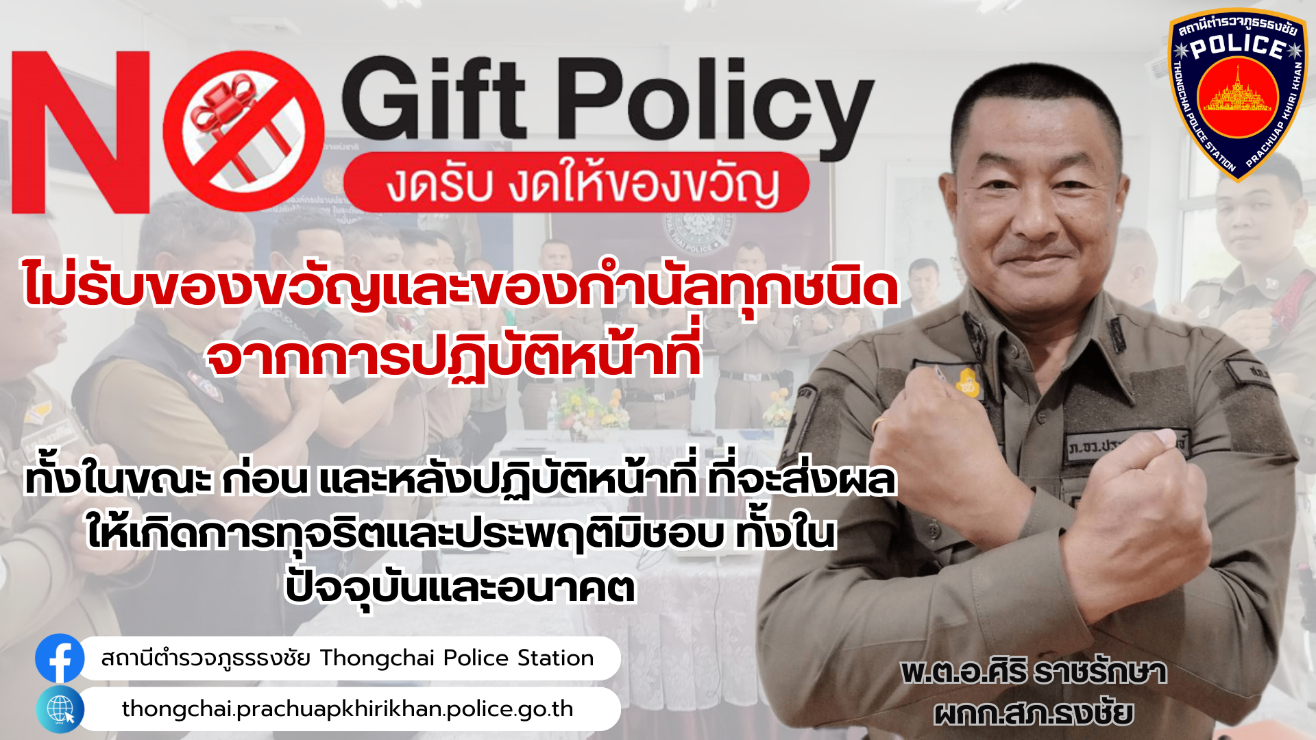 ผกก.สภ.ธงชัย ได้ประกาศนโยบายและมาตรการในการต่อต้านการทุจริต/การรับสินบนในงานที่เกี่ยวข้องกับด้านการสืบสวนและการสอบสวน