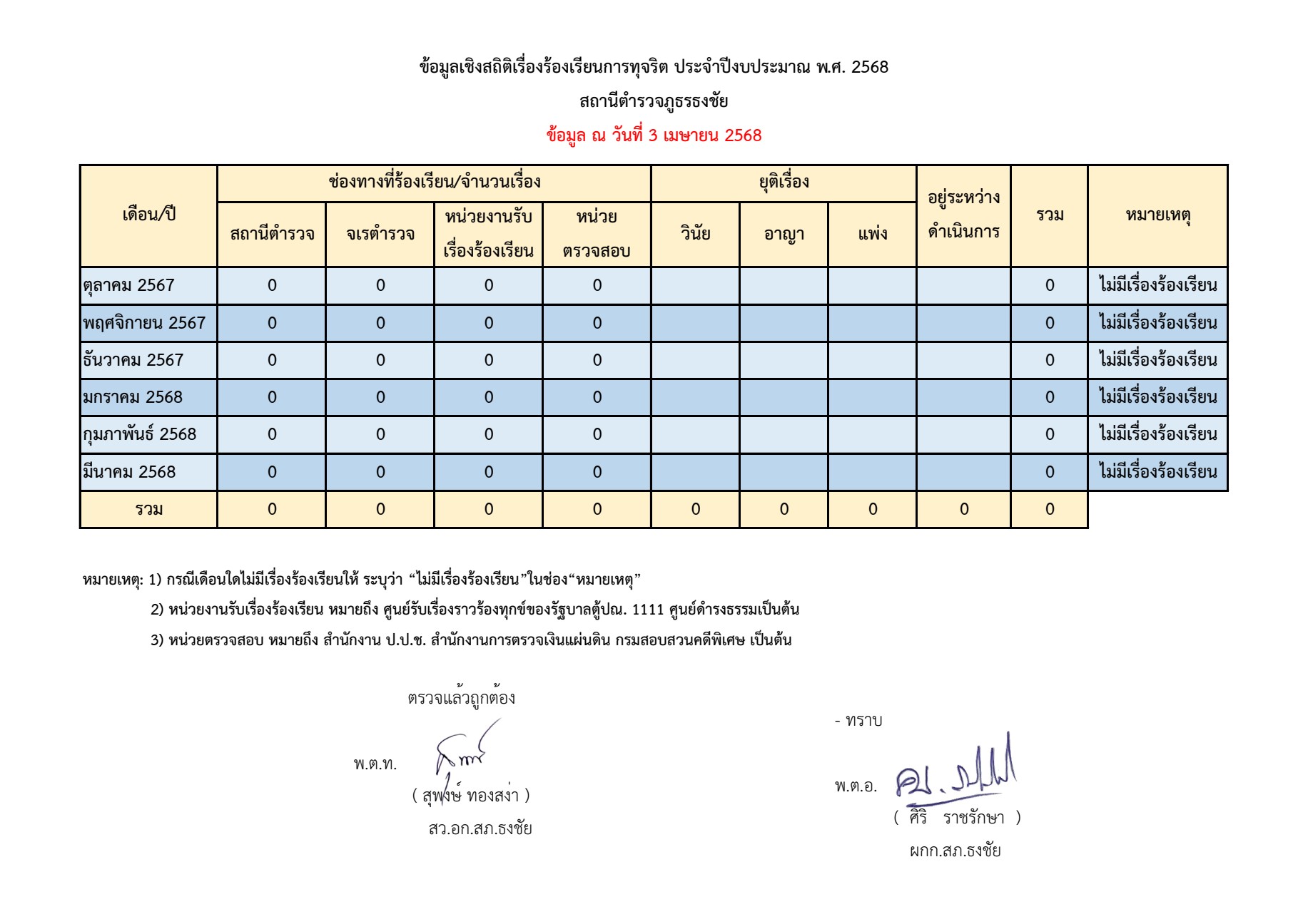 ข้อมูลเชิงสถิติเรื่องร้องเรียนการทุจริต เดือน ตุลาคม 2567 – มีนาคม 2568