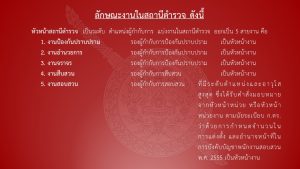 มีหน้าที่เกี่ยวกับการอำนวยการ การวางแผน การตรวจสอบติดตามและประเมินผลงานที่เกี่ยวกับนโยบาย ยุทธศาสตร์ และแผนงานของสถานีตำรวจ งานการบริหารบุคลากร งานจเรตำรวจงานกิจการพิเศษ งานความมั่นคง การศึกษา การฝึกอบรม งานวิชาการ สวัสดิการ การพัฒนา การบริหารจัดการ งบประมาณ การเงิน การพัสดุ การพลาธิการและสรรพาวุธ การส่งกำลังบำรุง รวมทั้งลักษณะงานอื่น ๆ ที่เกี่ยวข้องหรือเป็นส่วนประกอบของงานดังกล่าว เพื่อส่งเสริมหรือสนับสนุนการปฏิบัติงานของสถานีตำรวจ - งานป้องกันปราบปราม